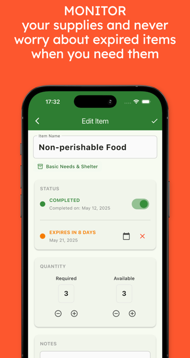 • Expiration Tracking: Never worry about expired emergency supplies with automatic expiration date monitoring and notifications.